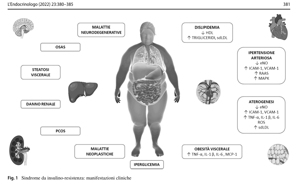 L’insulino resistenza è una condizione basata sull’alterazione del processo di trasduzione del segnale dell’insulina, per cui concentrazioni di normali o aumentate dell’ormone producono un effetto biologico attenuato. L’IR si manifesta con un quadro clinico variabile, noto come sindrome da insulino-resistenza, che include alterazioni metaboliche, obesità viscerale, danno d’organo e associazione con altre patologie: sindrome dell’ovaio policistico, sindrome metabolica, sindrome delle apnee ostruttive del sonno, malattie neurodegenerative, persino patologie neoplastiche.